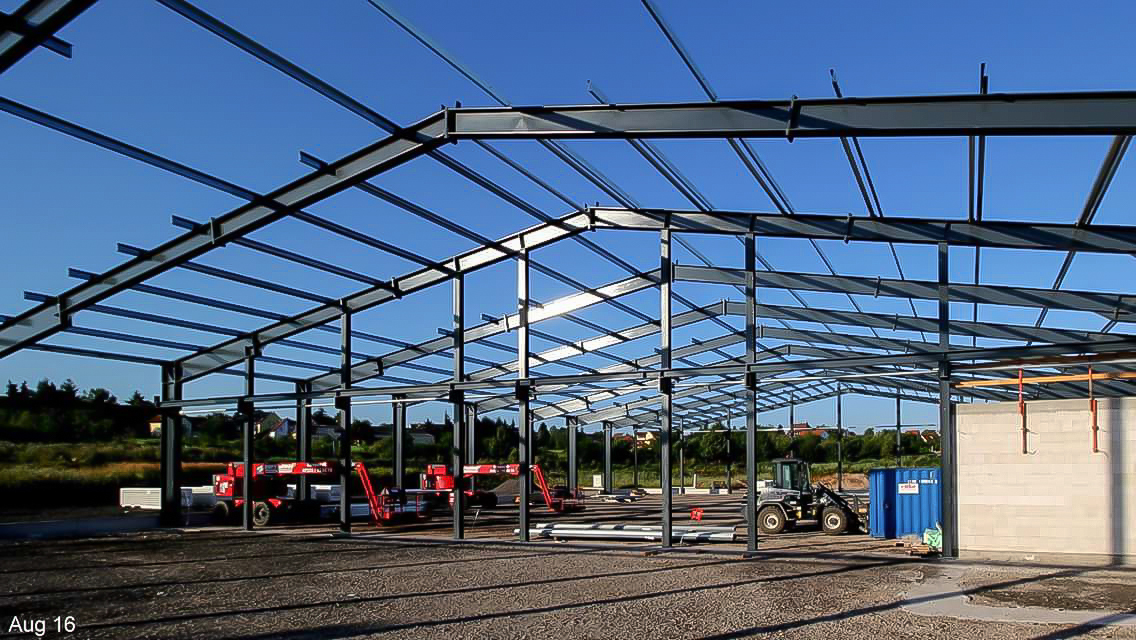 Das Video zeigt den Baufortschritt vom April 2016. Das Skelett der ersten Halle, sowie das Erdgeschoß des Bürogebäudes stehen bereits.
