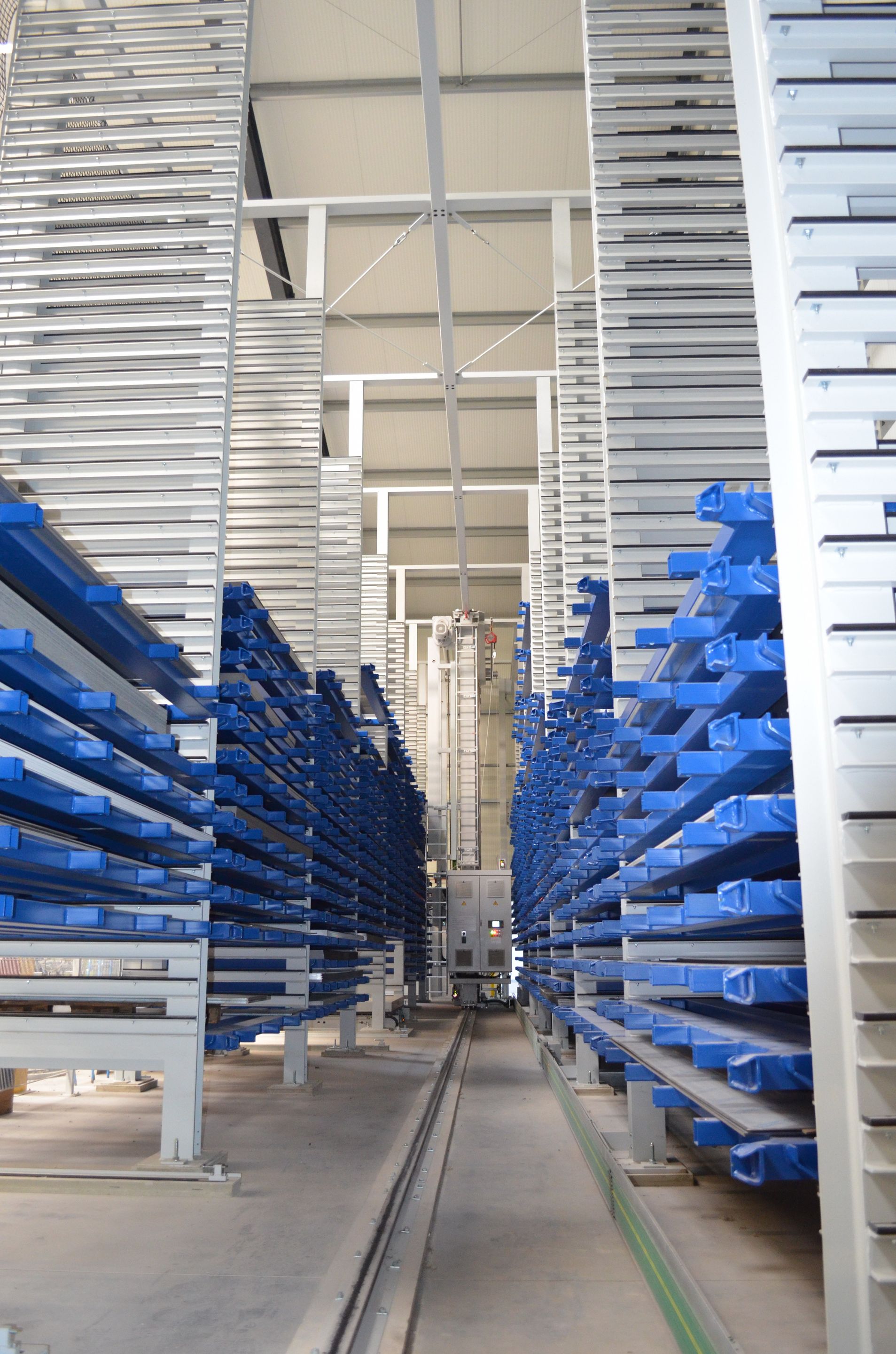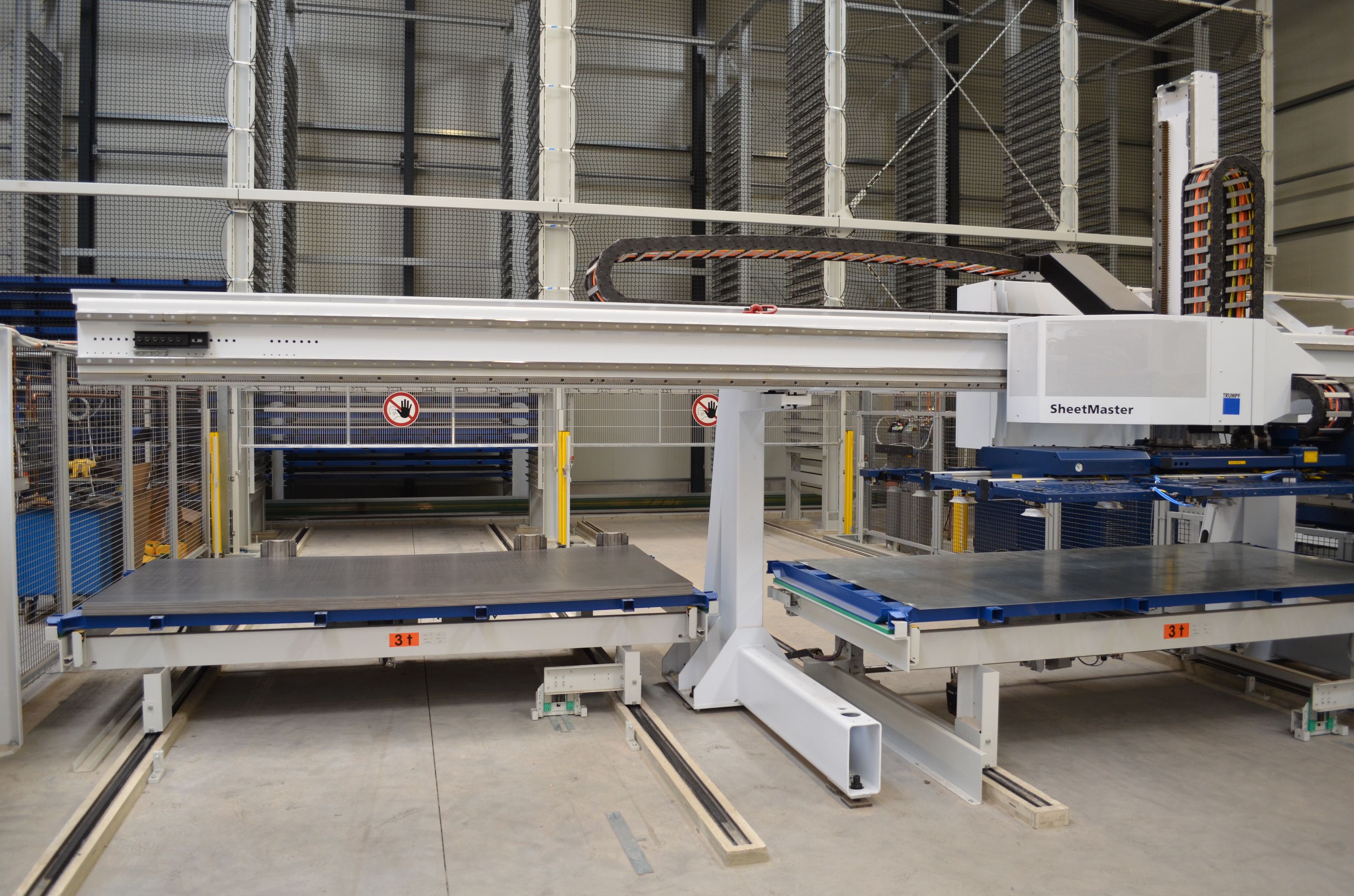 Das Lager bietet mit einer Höhe von acht Metern Platz für bis zu 686 Paletten, auf denen Bleche mit Abmessungen von maximal 3.000 x 1.500 Millimeter abgelegt werden können. Die Mitarbeiter können das benötigte Material einfach per Knopfdruck anfordern – nach nur wenigen Sekunden steht die gewünschte Palette vollautomatisch für sie bereit. Eine neu angeschaffte Stanz-Laser-Maschine ist sogar komplett mannlos an das Lagersystem angebunden: Vakuumsauger entnehmen die ausgelagerten Bleche und führen sie selbstständig der Anlage zu.