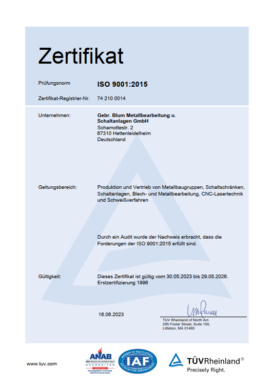 Wir leben unser Qualitätsmanagementsystem und sind zertifiziert nach DIN EN ISO 9001:2015Unsere Qualitätsphilosophie bezieht sich nicht nur auf unsere Einzelprodukte, sondern auch auf unsere Produktionsprozesse. Unsere Produkte werden mit höchster Qualität prozesssicher hergestellt. Das gewährleistet unser strenges Qualitätsmanagement. Wir garantieren Ihnen höchste Qualität “made in Germany”. Unser Streben nach diesem Ideal hat sich bezahlt gemacht – Wir bekamen ein Zertifikat für unser Qualitätsmanagementsystem.